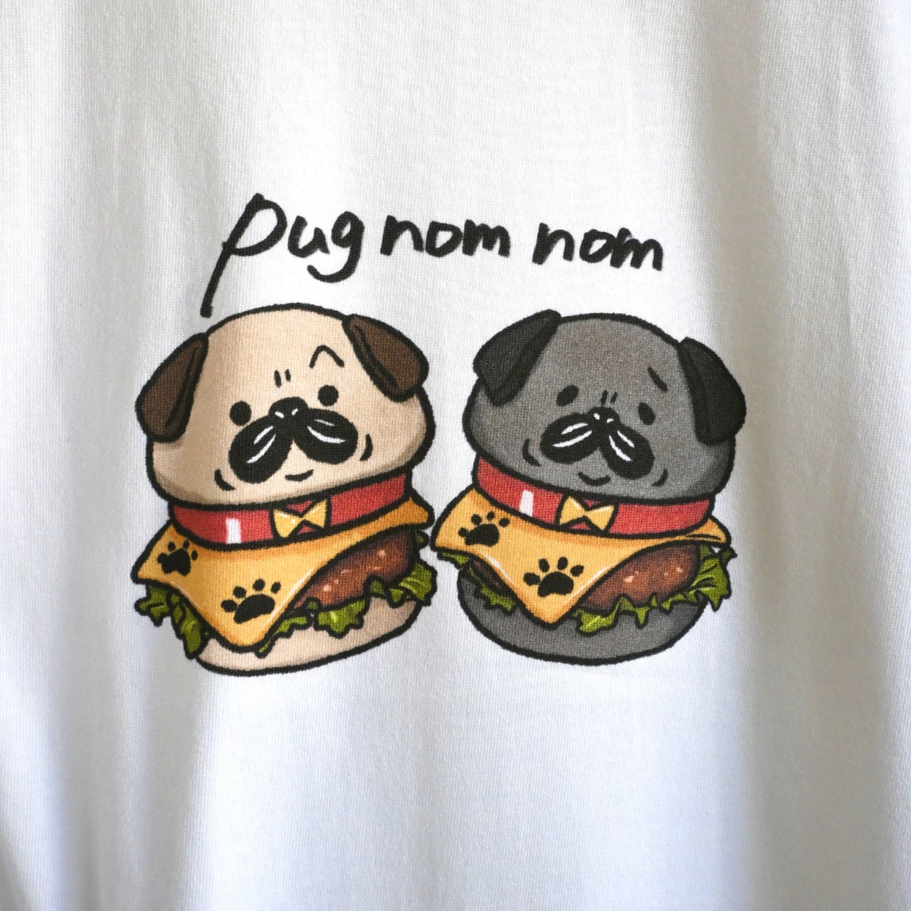 パグのむのむハンパーガー半袖Tシャツ。